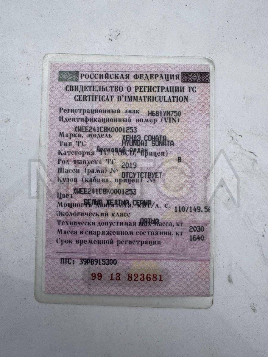 Марка и(или) модель: Hyundai Sonata Год выпуска: 2019 Идентификационный номер (VIN): XWEE241CBK0001253 Номер шасси (рамы): -- Номер кузова (кабины):-XWEE241CBK0001253 Цвет кузова (кабины): белый желтый серый Номер двигателя: - Рабочий объем (см3): 1999 Мощность (кВт/л.с.): 110.000/149.56 Экологический класс: пятый/5 Тип транспортного средства: Легковой седан. Пробег, км (по одометру): 292 112. Привод: Передний. Коробка передач: Автоматическая.